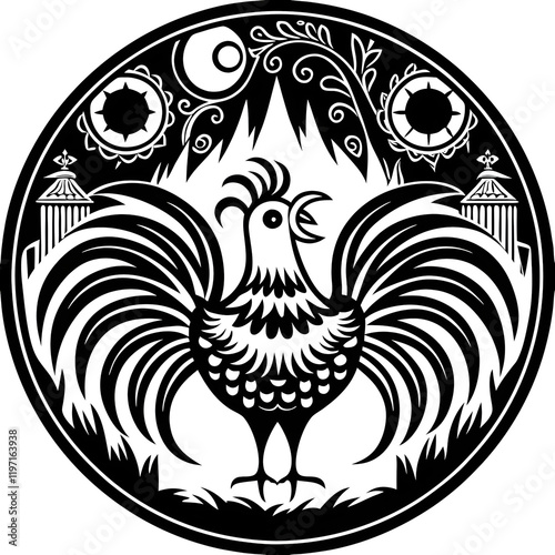 Obraz premium Artistic black and white print of a rooster with decorative elements