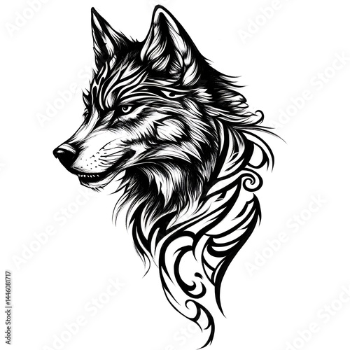 © Jeet, Naklejka premium Artistic black ink tribal wolf tattoo on a white background.