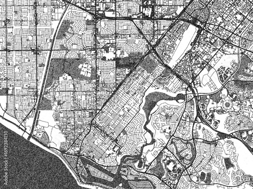 © W&S Stock, Naklejka premium Artistic city map of Costa Mesa, California, created in hand-drawn black and white for editorial or decorative projects.