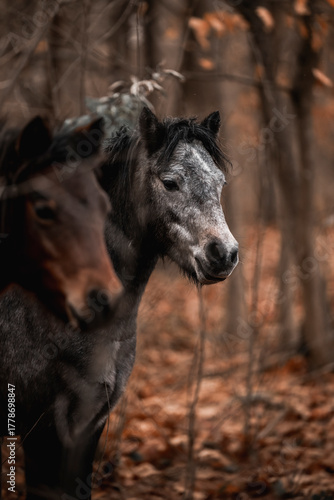 Fototapeta premium Artistic close-up of a dark horse pony head and mane backlit by intense...