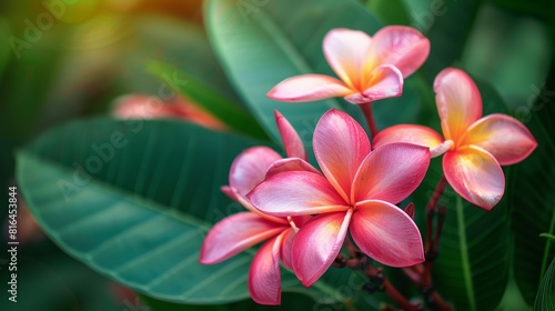 Naklejka premium Artistic close-up of tropical Plumeria flowers against a backdrop of green foliage, highlighting detail for advertising purposes