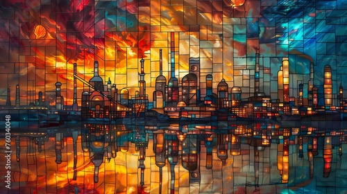 © soysuwan123, Obraz premium Artistic depiction of a city skyline and industrial silhouette against a vibrant, abstract sunset with reflections on water.
