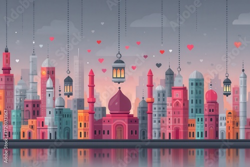 Fototapeta premium Artistic depiction of a vibrant city skyline adorned with lanterns and hearts...