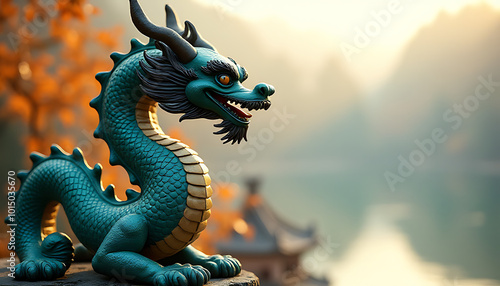 © fotoluigi868, Obraz premium Artistic dragon statue placed against a serene backdrop, capturing the elegance and power of traditional Chinese art._00001_