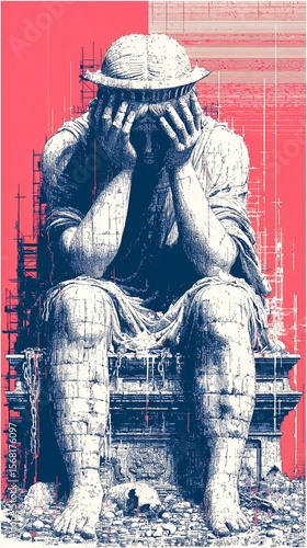 © Vilius, Fototapeta premium artistic duotone pink portrait stylized urban solitude sitting alone bench street art graffiti wall