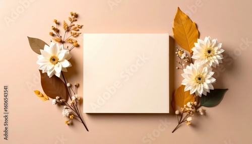 © BIZTECHART, Obraz premium Artistic floral composition with blank canvas studio setting photography minimalist environment top-down view nature inspired design