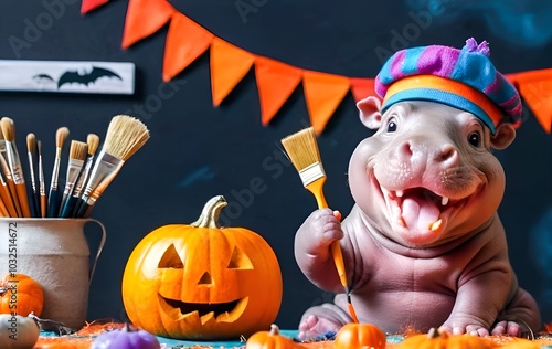 © chanafoto, Fototapeta premium Artistic Hippo Halloween: A cheerful hippopotamus artist in a beret, holding a paintbrush, poses beside a carved pumpkin. Perfect for Halloween and autumn themes.