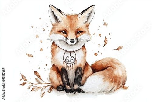 © Sukifli Dakheng, Obraz premium Artistic illustration of a fox with a dreamcatcher necklace