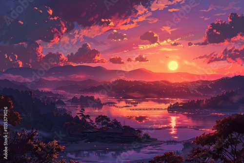 © happy_finch, Naklejka premium Artistic illustration of Japan at dusk