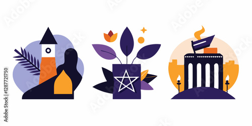Fototapeta premium Artistic illustrations of landmarks and nature elements on white background