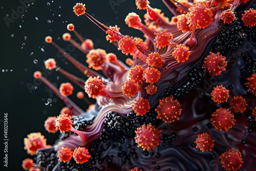 Fototapeta premium Artistic macro view of red cells encapsulating covid-19 virus particle