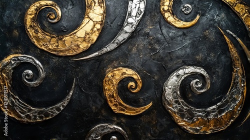 Naklejka premium Artistic metal swirls in gold and silver on a textured black background...