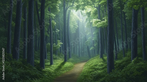 Obraz premium Artistic natural elements misty forest path bathed in gentle sunlight weaving...