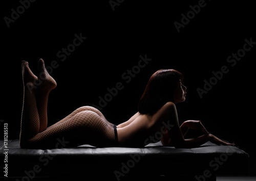 © Vitte Yevhen, Obraz premium Artistic nude portrait of a woman in fishnet tights lying on a couch under dramatic backlight. Minimalist style, play of light and shadow, elegant body curves and sensual mood.