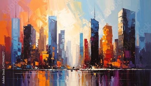 © Hanania Project, Obraz premium Artistic painting of skyscrapers. Abstract style. Cityscape panorama.