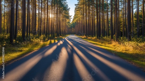 Fototapeta premium Artistic pathway through a serene pine forest, tall trees casting intricate shadows that create captivating patterns on the ground, inviting exploration and reflection.