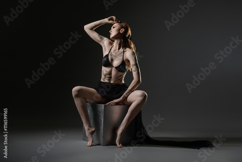 © Wisky, Fototapeta premium Artistic portrait of a model posing dramatically in a dim studio setting