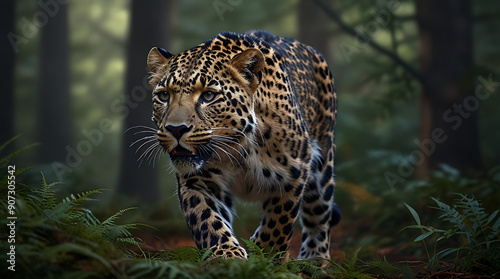 Obraz premium Artistic rendering of an Amur leopard prowling through a temperate forest,...