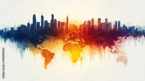 Obraz premium Artistic representation of a world map merging with a city skyline, symbolizing globalization
