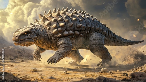 Fototapeta premium Artistic representation of an Ankylosaurus in a defensive pose, with its...