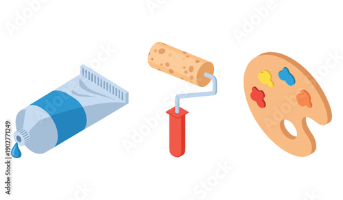 Fototapeta premium Artistic tools: paint tube, roller, and palette for creative projects