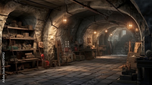 Fototapeta premium Artistic underground bunker with art gallery and studio. Generative AI.