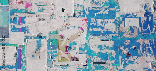 © Alex, Naklejka premium Artistic Urban Street Background with Grungy Wall with Ripped, Torn And Peeled Posters. Old Wall with Scratched Advertising. Old Billboard with Torn Posters. Vintage Wide Background and Texture.
