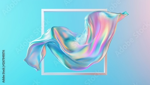 Fototapeta premium Artistic Wallpaper Design Featuring Iridescent Holographic Foil On Blue Background With Folded Cloth Falling And Copy Space