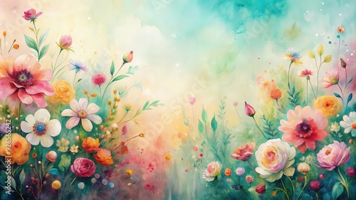 © Vibrant Visions Pixe, Obraz premium Artistic watercolor and acrylic smear flower blot painting with abstract texture pastel color stain on a horizontal long background