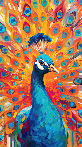 Fototapeta premium Artwork Created using Generative AI: Colorful, Cute, and Upscaled Friends, Featuring Fantasy Art and Adorable Monsters with Unique Charm. Peacock feather close up. Colorful feathered friend.