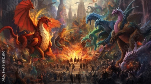© Damian Sobczyk, Obraz premium Artwork showcasing a diverse array of legendary creatures from folklore and mythology, such as dragons, griffins, unicorns, and phoenixes, gathered in a majestic and awe - inspiring setting