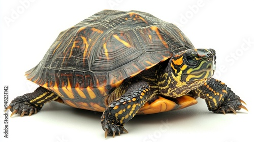 © schmidt, Obraz premium As a turtle swims in a river, its shell with distinct patterns stands out against a light background