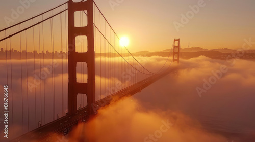 © Santy Hong, Obraz premium As dawn breaks over the bay, the Golden Gate Bridge emerges from the thick fog like a majestic sentinel, its rust-colored spans illuminated by the first rays of sunlight.