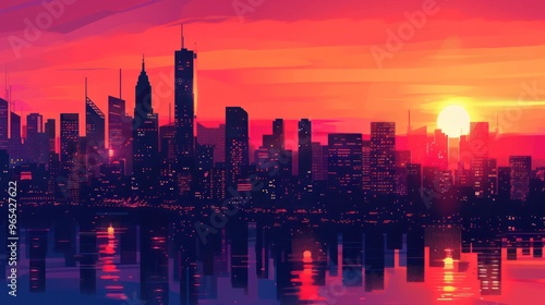 Fototapeta premium As the last rays of sunlight fade into the horizon, the city below awakens with a kaleidoscope of colors, its towering skyscrapers casting long shadows across the landscape.