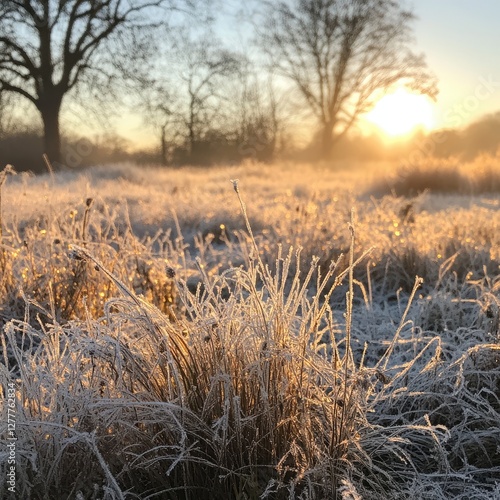 Fototapeta premium As the sun rises, the frosted grass glimmers under its warm light, creating a...