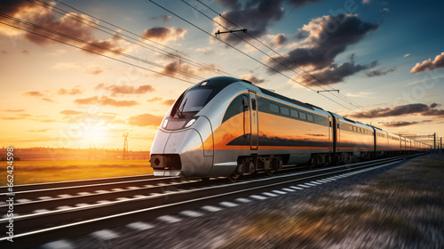 Naklejka premium As the sun sets, a high-speed passenger train races along the railway, offering a glimpse of railroad travel..