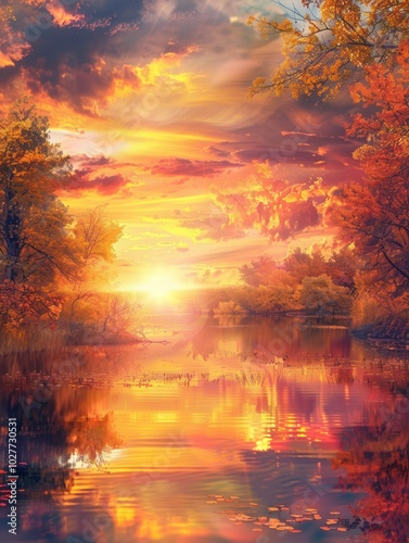 Obraz premium As the sun sets over the calm waters, the sky bursts with colors while autumn...