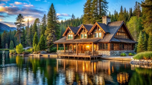 Fototapeta premium As the sun shines brightly, the rustic lakefront lodge undergoes a tranquil...