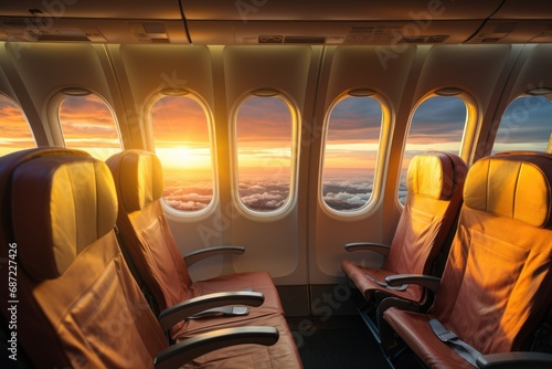 Fototapeta premium As the train-like aircraft cabin glides through the sky, passengers bask in the warm glow of the sunset, their seats a perfect vantage point for the breathtaking view