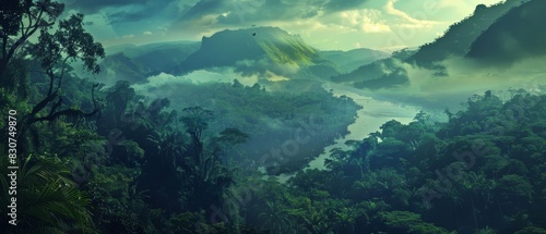 Fototapeta premium As twilight descends, an emerald jungle unfurls along a winding river, with mist clinging to the mountainous backdrop, creating a layered tapestry of nature's serenity.