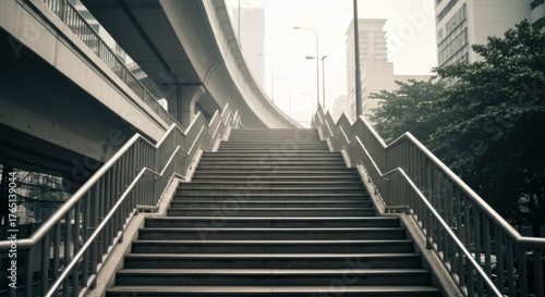 Fototapeta premium Ascending outdoor concrete staircase with railing, leading upwards towards cityscape