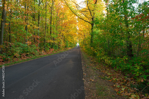 © boguslavus, Obraz premium Asfaltowa droga przez liściasty las. Jest jesień, większość liści na drzewach ma żółty kolor.