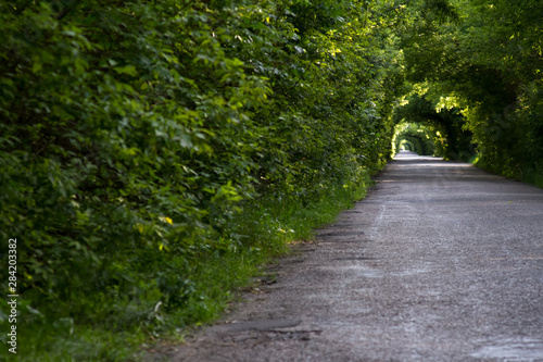 Naklejka premium Asfaltowa droga wśród lasu, gałęzie drzew zbiegają się nad drogą, selektywne...