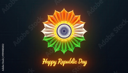 Fototapeta premium Ashoka Chakra in tricolor with glowing text Happy Republic Day underneath.
