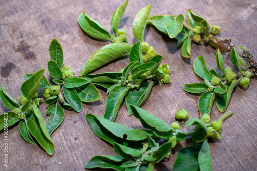 © Kiran, Fototapeta premium ashwagandha Berry on wooden background. Withania somnifera plant