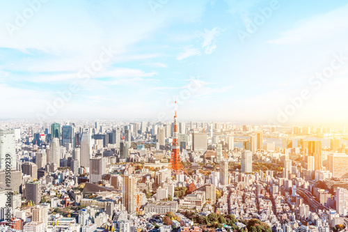 Fototapeta premium Asia Business concept for real estate and corporate construction - panoramic modern city skyline bird eye aerial view of tokyo tower and odaiba under blue sky in Roppongi Hill, Tokyo, Japan