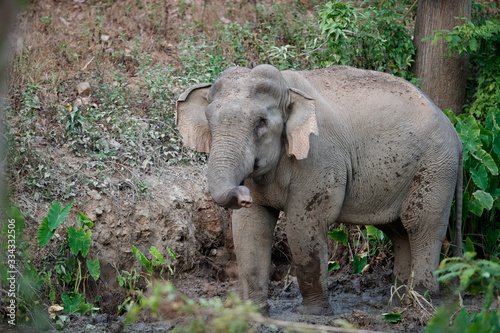 © Thipwan, Naklejka premium Asia elephant (Elephas maximus) or Asiatic elephant, angle view, side shot, playing happily in mud swamp in tropical evergreen forest on sunset, Kaeng Krachan National Park, the jungle of Thailand.