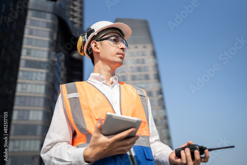 Fototapeta premium Asia engineer man working use walkie talkie with building background at...