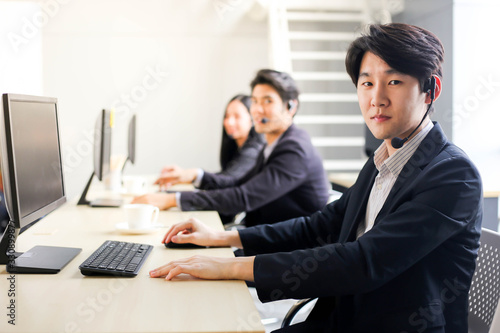 Fototapeta premium Asia Group of call center workers or Confident business team with headset in office.