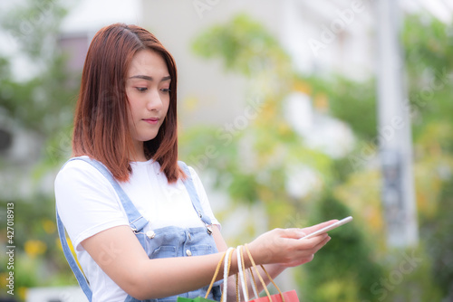 © sap, Obraz premium Asia woman using with smart phone in the street